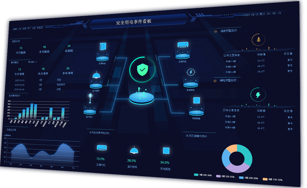 对电器设备及线路进行实时监测和用电安全管控,提升事件预警和处理能力。当电器设备或周围环境出现异常情况时发出设备检查与维护预警,防止意外事故发生。